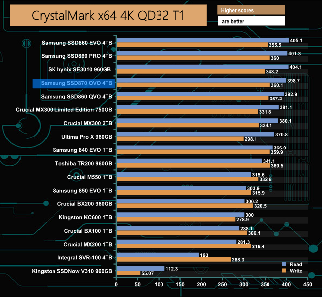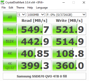 The SSD 870 QVO is a shade faster than the previous SSD 860 QVO for both read and writes in CrystalDiskMark. Looking at the two benchmark result screens it appears that the new Samsung MKX controller doesn't have a preference when it comes to the type of data it is being asked to handle.