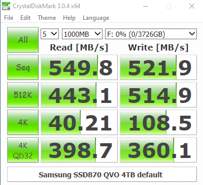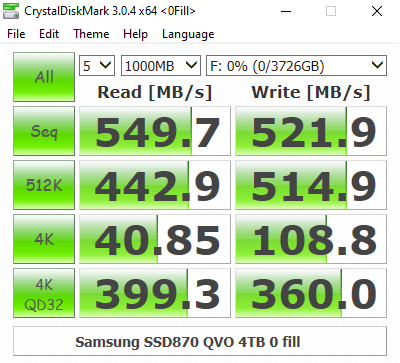 The SSD 870 QVO is a shade faster than the previous SSD 860 QVO for both read and writes in CrystalDiskMark. Looking at the two benchmark result screens it appears that the new Samsung MKX controller doesn't have a preference when it comes to the type of data it is being asked to handle.