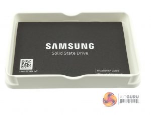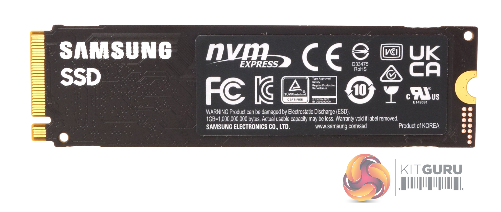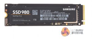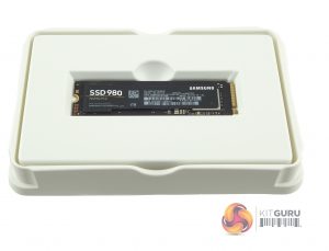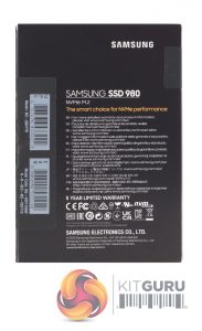 Samsung’s SSD 980 comes in a black box with a large image of the drive on the front with the focus on the controller. On the top left-hand side of the box, we find a sticker displaying the drive’s 1TB capacity. Also displayed is the drives 3,500MB/s Sequential read speed. The rear of the box has a multilingual information panel giving the web address for more detailed warranty information. Under this is a reminder that the drive has a 5-year limited warranty.