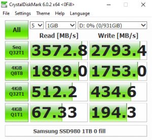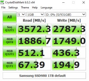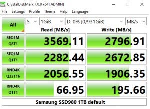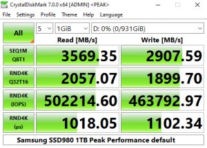 Samsung rate the 1TB SSD 980 as up to 3,500MB/s and 3,000 for Sequential read and writes respectively. We could confirm those figures with CrystalDiskMark 7 with a read performance figure of 3,569MB/s with writes a little shy of the maximum figure at 2,907MB/s.