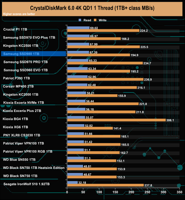 In relation to the other drives around it, the SSD 980 shows better performance in CrystalDiskMark's 4K QD1 test as it sits in the top five of drives tested to date.