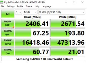 CrystalDiskMark 7 includes a couple of profiles that can be used for testing – Peak Performance and Real World. The result screens for these two profiles not only display MB/s results but also IOPS and latency.