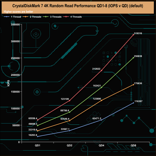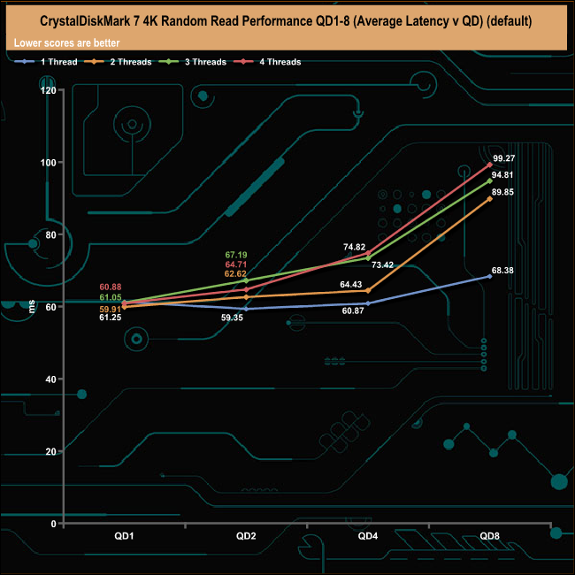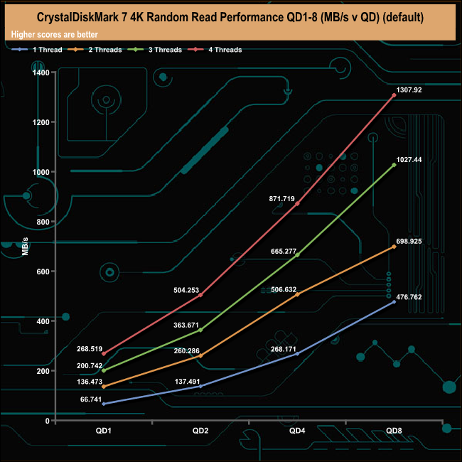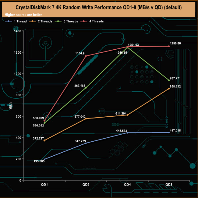 We also used CrystalDiskMark 7 to test the random performance of the drive at lower queue depths (QD1 – QD8 where most of the everyday workloads occur) using 1 to 4 threads.
