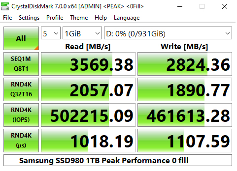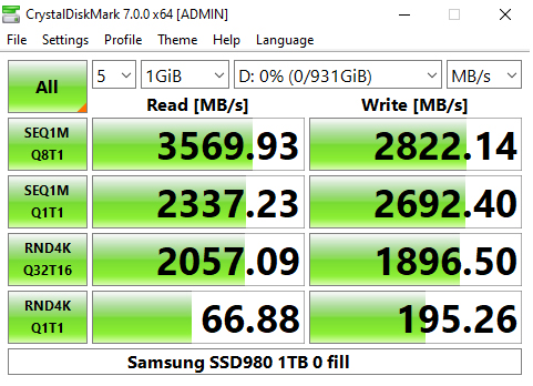 Samsung rate the 1TB SSD 980 as up to 3,500MB/s and 3,000 for Sequential read and writes respectively. We could confirm those figures with CrystalDiskMark 7 with a read performance figure of 3,569MB/s with writes a little shy of the maximum figure at 2,907MB/s.