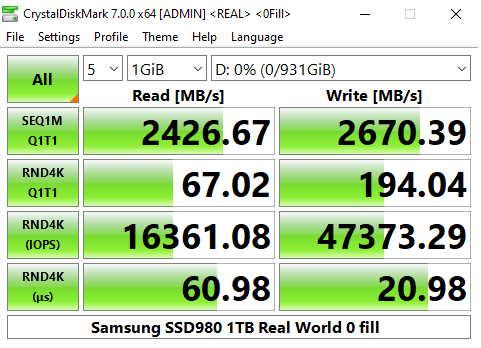 CrystalDiskMark 7 includes a couple of profiles that can be used for testing – Peak Performance and Real World. The result screens for these two profiles not only display MB/s results but also IOPS and latency.