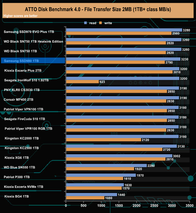 Official Sequential performance figures for the 1TB drive are up to 3,500MB/s reads and 3,000 for writes. Using the ATTO benchmark we couldn't quite reach those maximum figures with the tested drive producing figures of 3,230MB/s for reads and 2,790MB/s for writes.