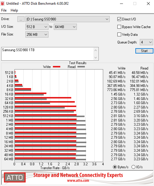 The ATTO Disk Benchmark performance measurement tool is compatible with Microsoft Windows. Measure your storage systems performance with various transfer sizes and test lengths for reads and writes. Several options are available to customize your performance measurement including queue depth, overlapped I/O and even a comparison mode with the option to run continuously.