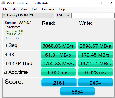In the AS SSD benchmark, the drive produced a read score of 2161 but a more impressive write score of 2404, one of the fastest write scores we've seen to date for this class of drive.