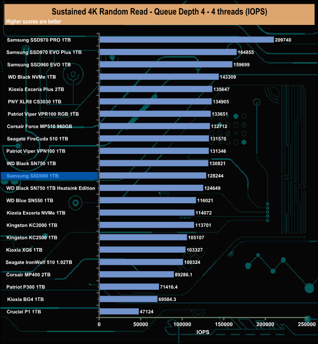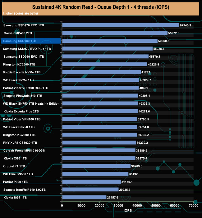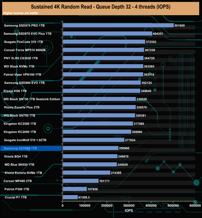 In our 4-threaded random read test, the drive peaked at 250,960 IOPS (1027.93MB/s). Samsung quote two 4K random read figures for the drive, up to 17,000 IOPS at QD1 using a single thread and up to 500,000 IOPS at QD32 using 16 threads. Our 4-threaded test results sit comfortably between the two official figures.