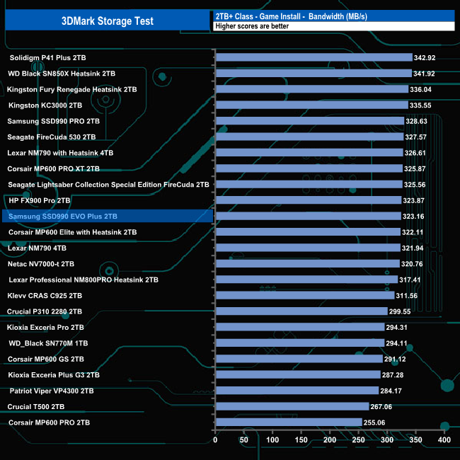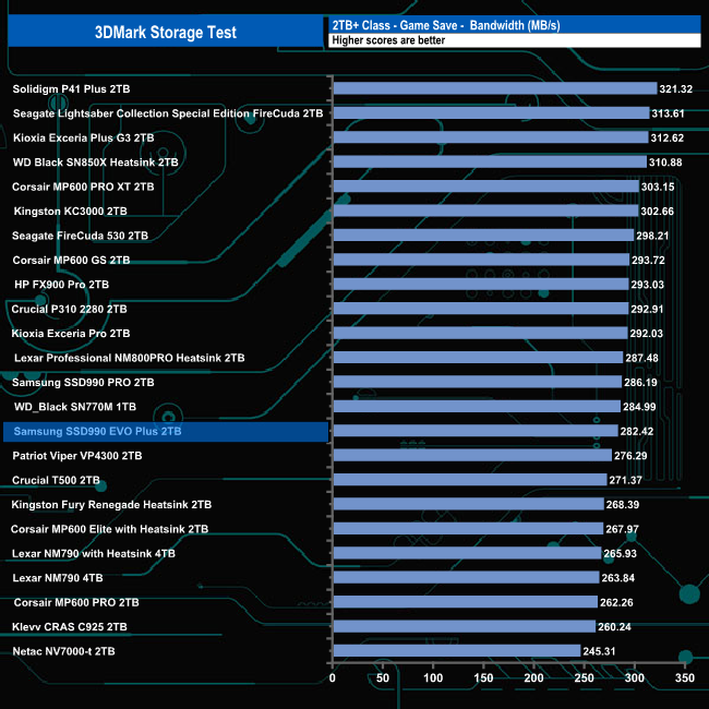 Samsung's 2TB SSD990 EVO Plus does well overall in the 3DMark Storage Benchmark with an average bandwidth figure of 628.74MB/s, which is good enough for sixth place in the results chart.