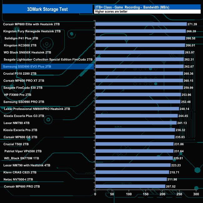 In the Game Recording test, the SSD990 EVO Plus finished a few places higher in the results table than the older SSD990 PRO drive.