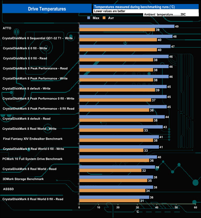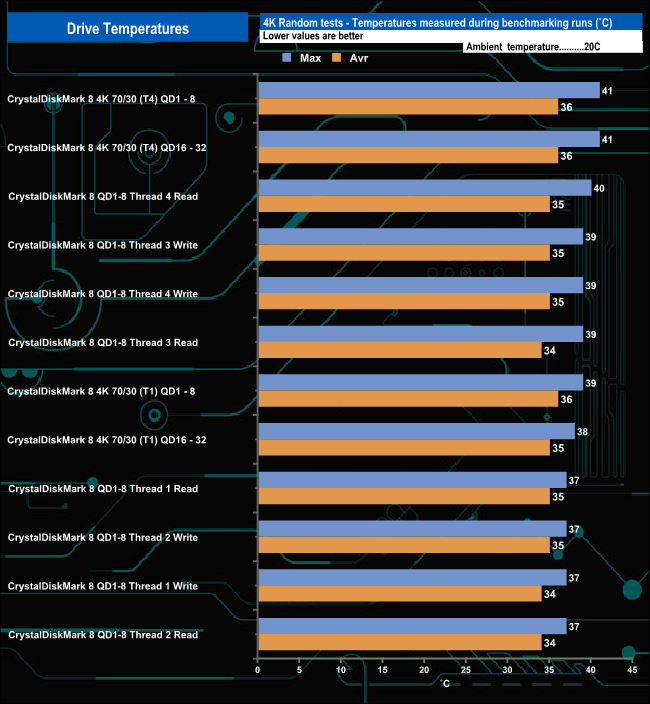 This system does work pretty well as the hottest the drive got when being pushed hard during our benchmarking was 49° C (during runs of ATTO) which is 21° C off of the stated maximum operating temperature of 70°C. For the bulk of our testing, the temperature averaged around 42° C, well below that maximum temperature while the 4K-based tests averaged 38.5° C.