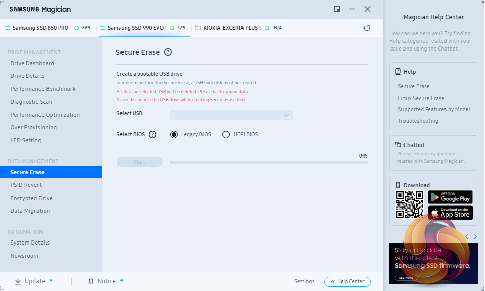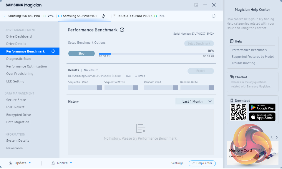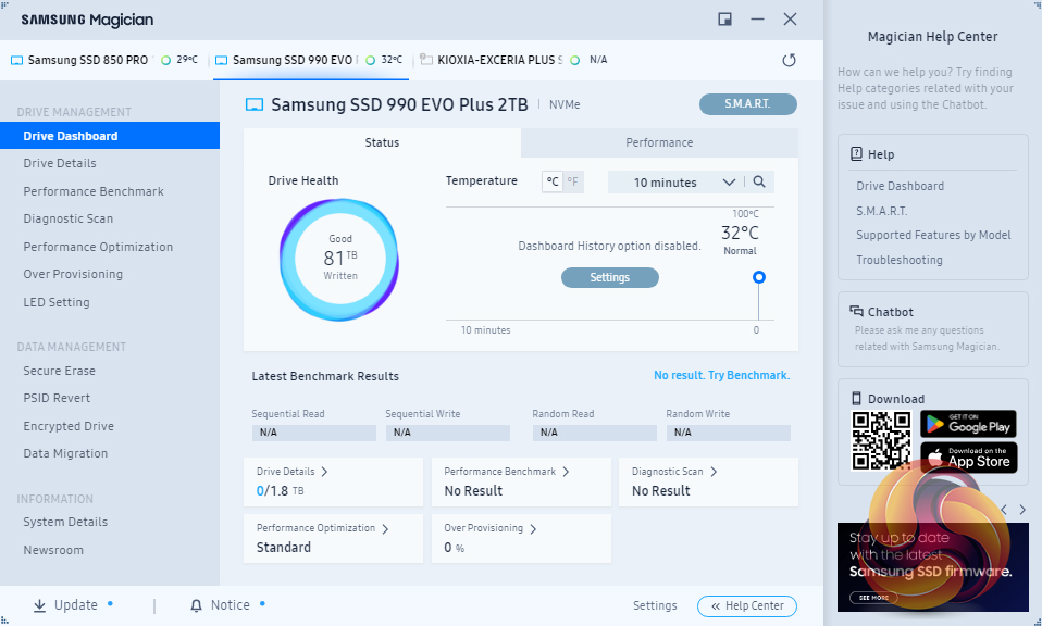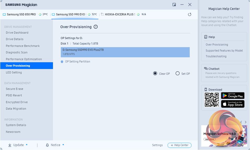 Samsung’s SSD management utility goes by the name of Magician and can be downloaded from Samsung’s website. Samsung continually updates Magician and the latest version (at the time of writing) is v8.2, Magician is a pretty comprehensive utility that allows you to do most of the maintenance jobs you may need to do with an SSD and lists them under two headings; Drive Management and Data Management.