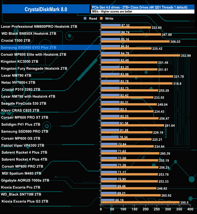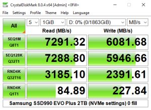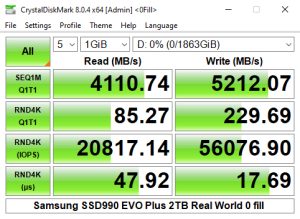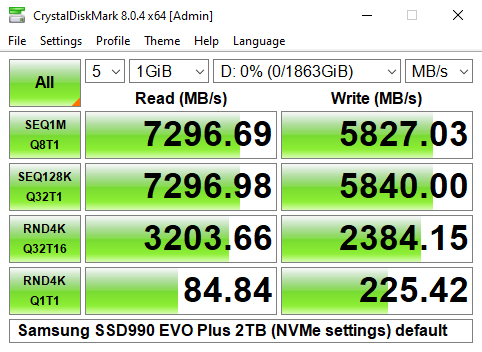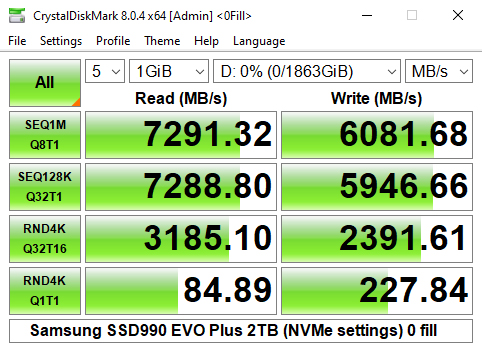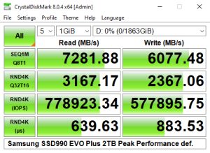 In the CrystalDiskMark 4K QD1 test, the SSD990 EVO Plus has a slightly faster read result than the SSD990 Pro but the older drive has a slightly better write performance.