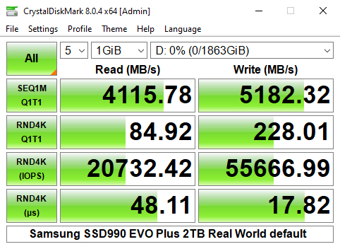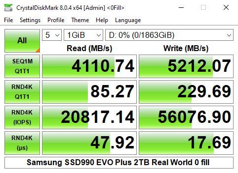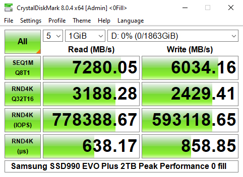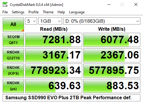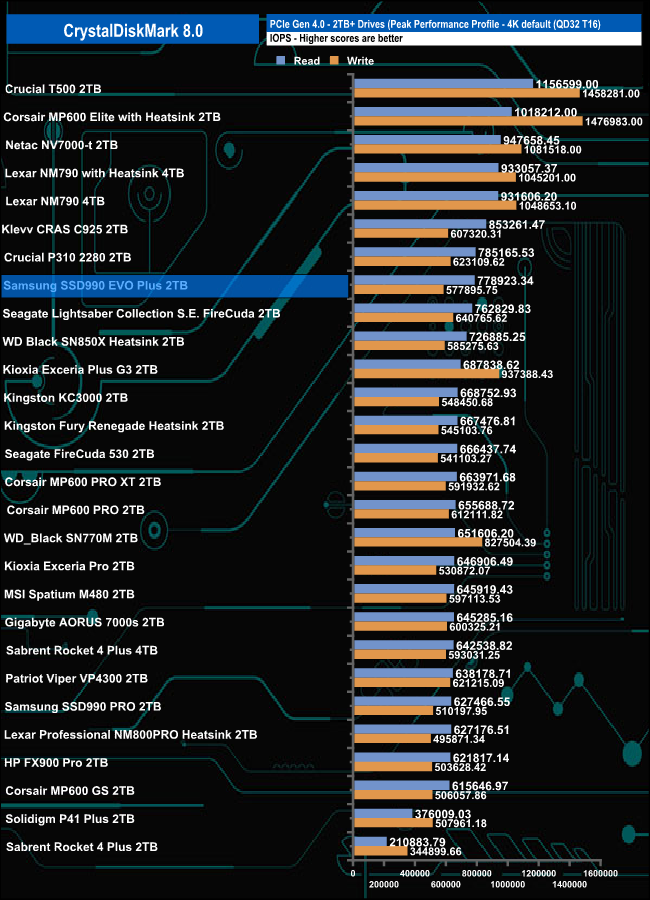 When it came to tested 4K performance our results scores came nowhere close to the official maximums. Samsung rates the 2TB 990 EVO Plus at up to 1,000,000 IOPS for reads and up to 1,350,000 IOPS for writes. The best we saw using the default Peak Performance Profile was 778,923 IOPS for reads and 577,895 IOPS for writes, figures that just get the drive into the top 10 of our result chart.