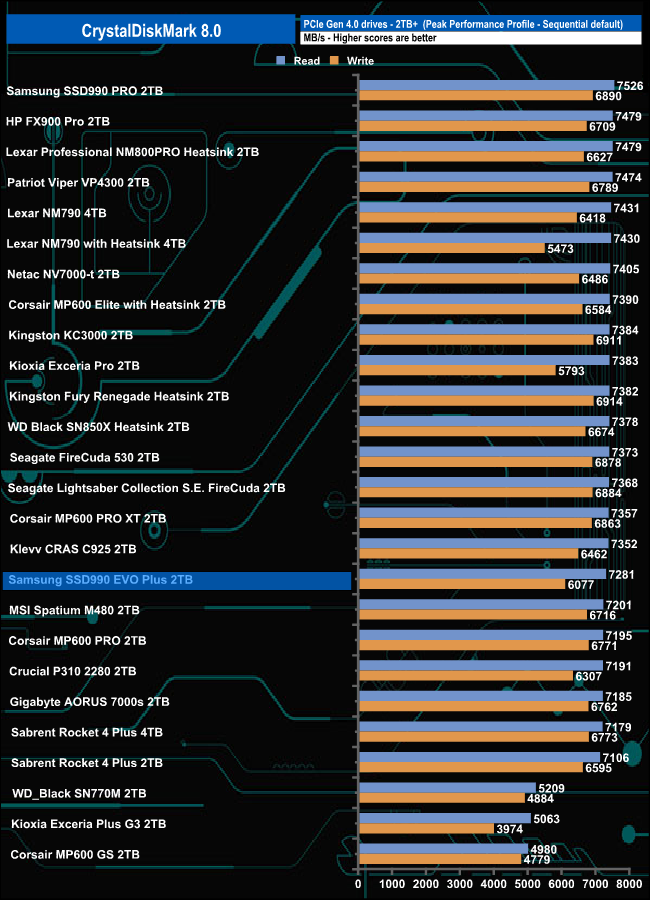 Using CrystalDiskMark 8's Peak Performance Profile we could, once again confirm the official Sequential read figure with a test result of 7,281 while write performance was way short of the maximum 6,300MB/s at 6,077MB/s.