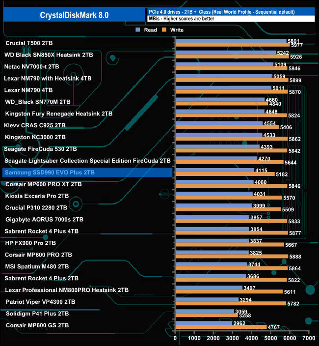 Those Sequential figures of 7,296MB/s (reads) and 5827MB/s (writes) see the drive in a mid-table position.