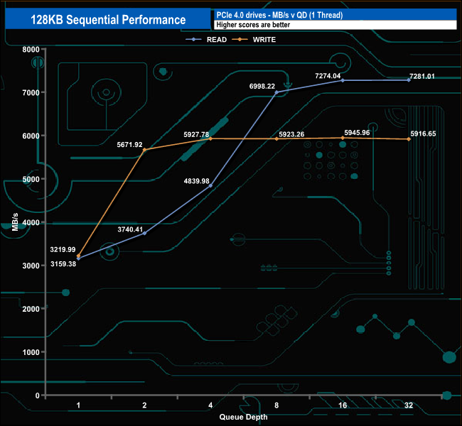 In these Sequential tests could confirm the official read rating of up to 7,250MB/s with a result of 7,281MB/s however the write result wasn't as strong at 5,916MB/s, some 384MB/s short of the official maximum write figure.
