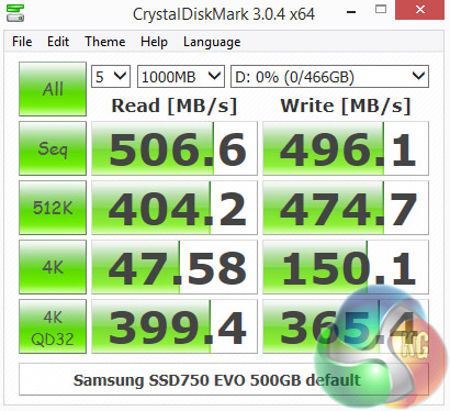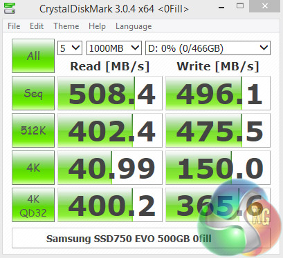 Samsung's 500GB SSD750 EVO handles the deeper 4K queue depths of the Crystal Disk Mark benchmark QD32 test pretty well. At a shallow depth it is the same story with strong 4K write performance, but the 4K reads are pretty good too.