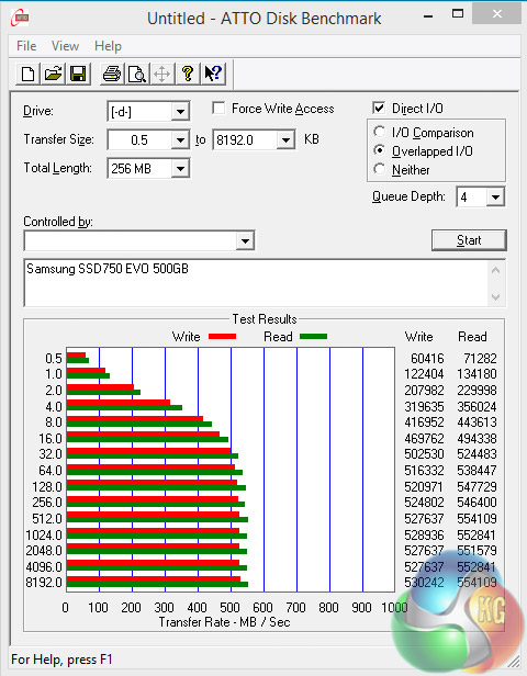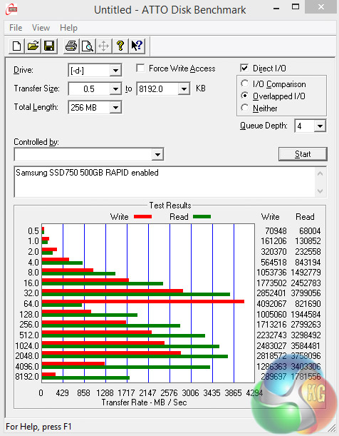 With RAPID mode turned on the Sequential read score in ATTO rockets up from the 551MB/s up to a 3758MB/s. The rise in the write score isn't quite so dramatic, rising from 527MB/s to 2818MB/s.