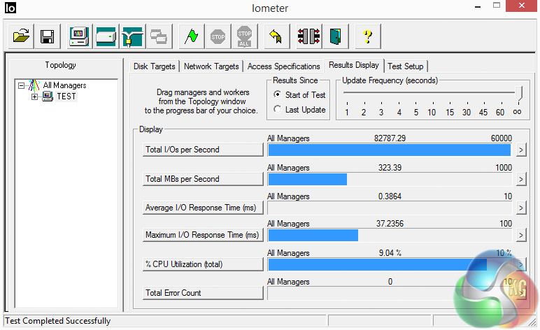 The interesting thing in the IOMeter 4K random read/write tests is that both reads and writes get the same sort of boost with the RAPID mode. The reads rise boosts the performance from 97,482 IOPS to 103,989 IOPS while the random 4K writes, rise from 82,787 IOPS to 88,004 IOPS.