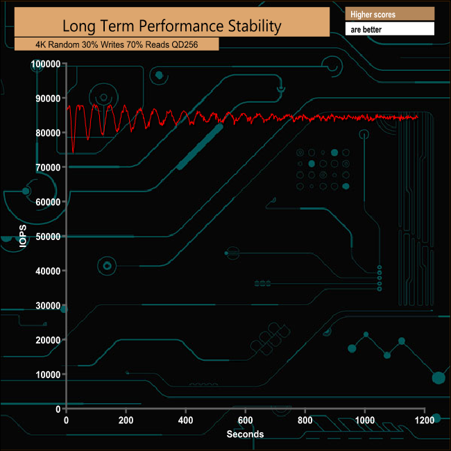 For the long term performance stability test, we set the drive up to run a 20-minute 4K random test with a 30% write, 70% read split, at a Queue Depth of 256 over the entire disk. The Samsung SSD860 EVO averaged 84,279 IOPS for the test with a performance stability of 97% which, for a drive aimed at the consumer market is superb.