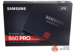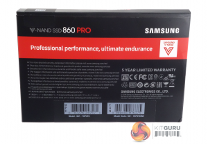 The Samsung SSD860 PRO 4TB ships in a compact black box with an image of the drive on the front along with information about the drive in that it uses V-NAND and has a SATA 6Gb/s interface. There is a sticker on the top left of the box which indicates the capacity of the drive. The rear of the box has multilingual marketing notes and the fact the drive has a 5 year warranty.