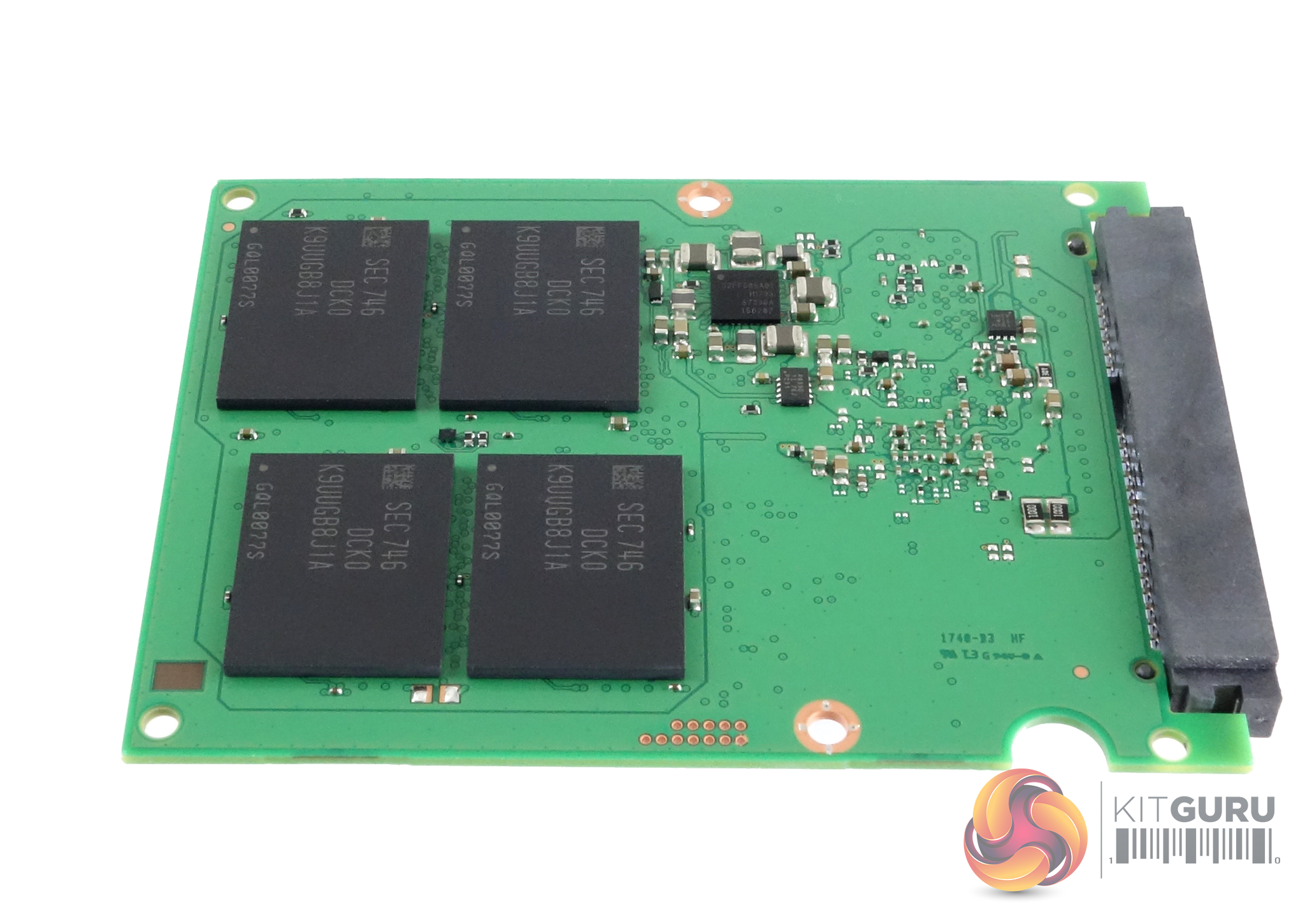 The SSD860 PRO uses Samsung's 256Gb (32MB) die size, 64-layer MLC V-NAND. Four 512GB NAND packages (coded K9UUGB8JA ) occupy one side of the PCB while on the other side are another four 512GB NAND packages, the 4GB LPDDR4 cache IC and the Samsung MJX (S4LR030) 8-channel controller.