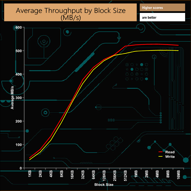The read throughput of the SSD860 PRO has a slight wobble at the 256KB block level but the performance very quickly picks up to peak at 527.78MB/s at the 4MB block size. Writes peak at the 8MB block level at 501.82MB/s.
