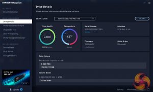 Magician allows you to do most maintenance jobs you may need to do with an SSD; updating firmware, optimise performance, adjust the Over Provisioning, enable data security (the drive supports AES 256-bit full-disk encryption, TCG/Opal V2.0, and Encrypted Drive -IEEE1667 (MS eDrive ) ) and securely erase the drive. Magician also features a built-in benchmark tool.