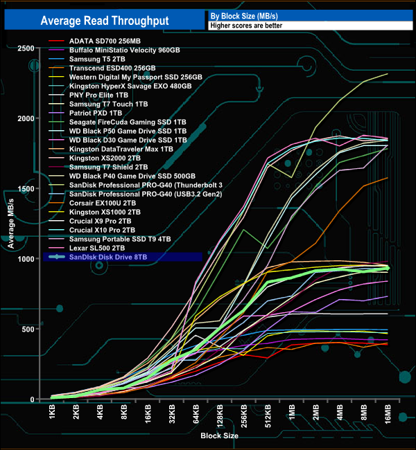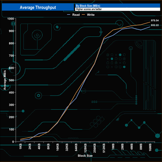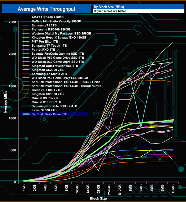 SanDisk rates the 8TB Desk Drive at up to 1,000MB/s for Sequential reads. In our throughput tests, the drive didn't quite hit that official maximum with a peak read figure of 932.22MB/s (16MB block). The spec sheet for the drive didn't have any write performance figures but in our throughput test, the drive peaked at the end of the test (16MB block) at 970.54MB/s.