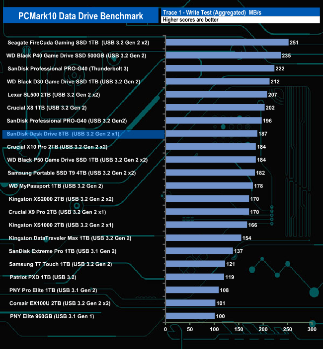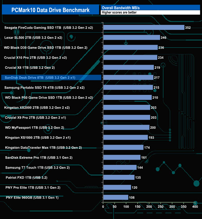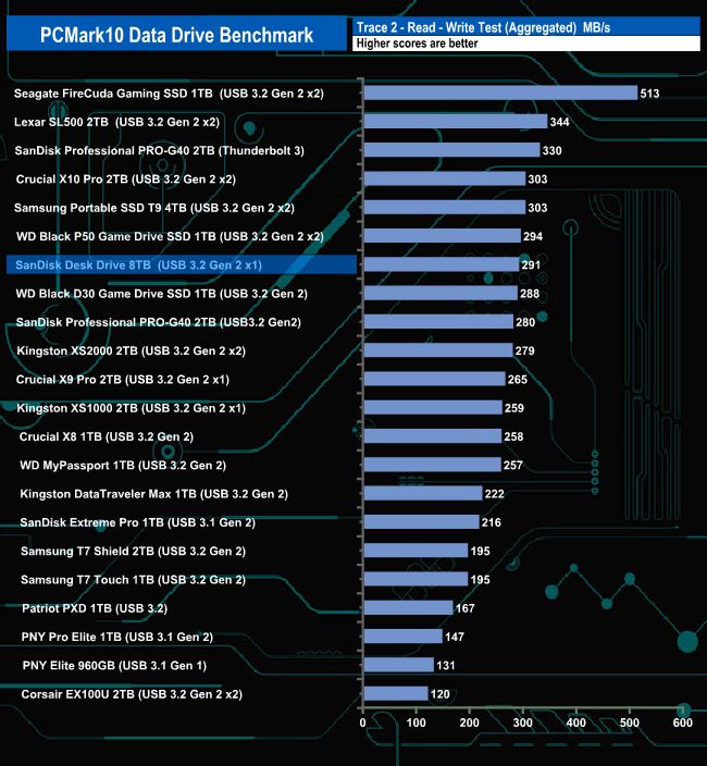 The 8TB Desk Drive handles the PCMark 10 Data Drive Benchmark well enough. It sits in the top 10 drives for all three parts of the benchmark run (Read-Write, Read and Write traces). It performs best by a very small margin in the Read-Write test. Its overall bandwidth result of 217MB/s sees the drive in sixth place on the results chart.