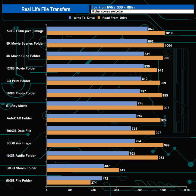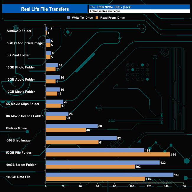 To test the real-life performance of a drive we use a mix of folder/file types and by using the FastCopy utility (which gives a time as well as MB/s result) we record the performance of the drive reading from & writing to a 256GB Samsung SSD850 PRO.