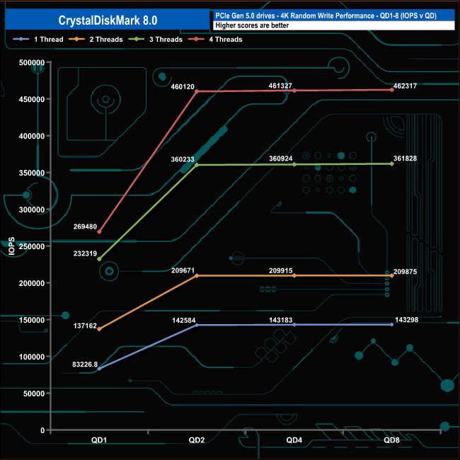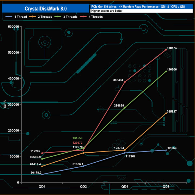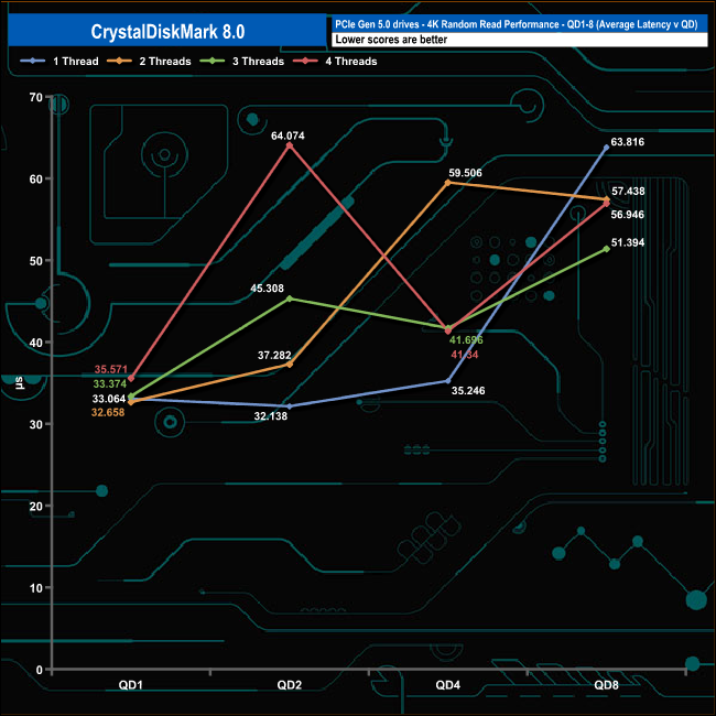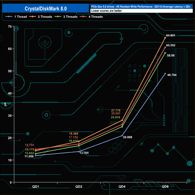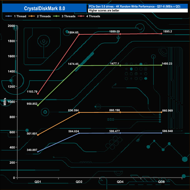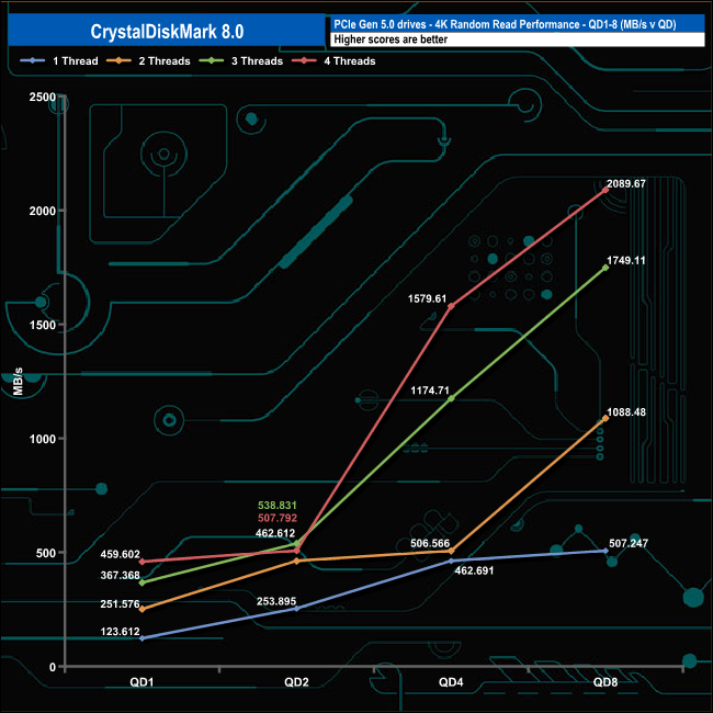 We used CrystalDiskMark 8 to test the random performance of the drive at lower queue depths (QD1 – QD8, where most of the everyday workloads occur) using 1 to 4 threads.