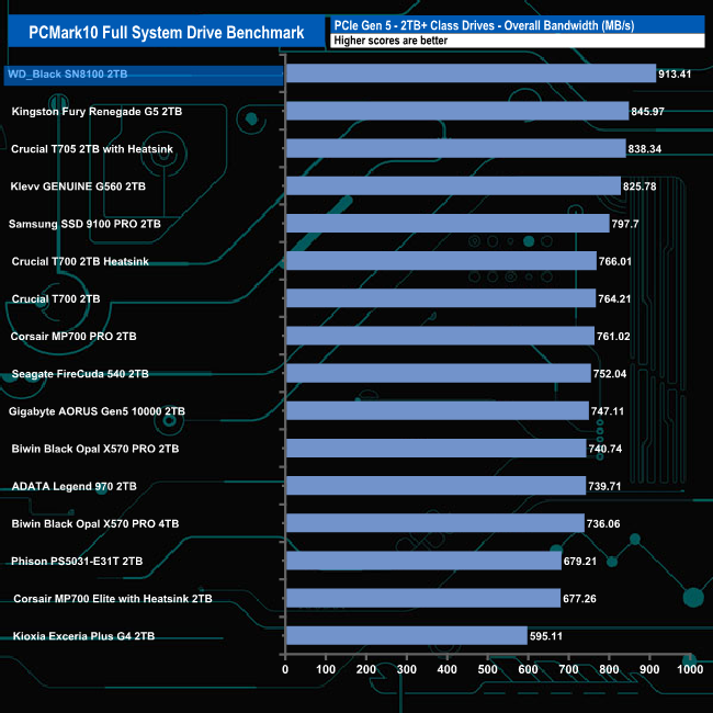 The WD_Black SN8100, with a test result of 913.41MB/s, slots straight into to top spot, 67MB/s faster than Kingston's Fury Renegade G5 drive.