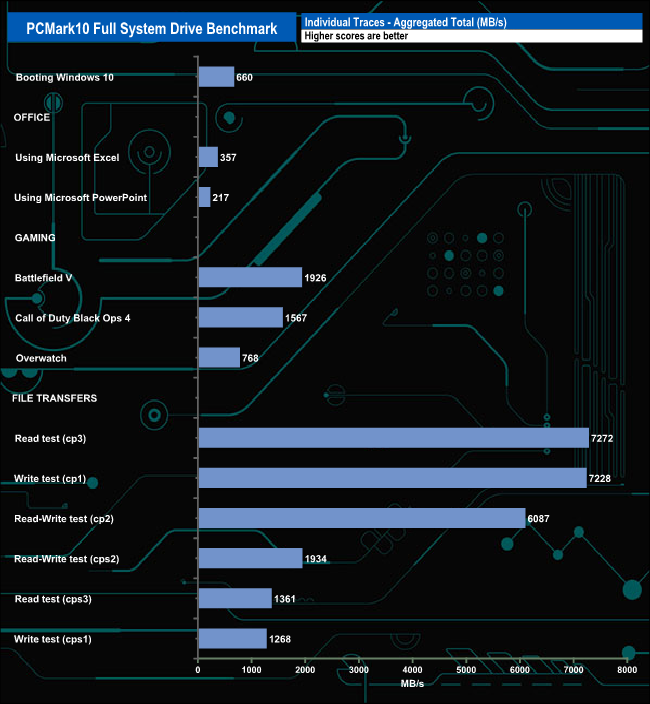 The PCMark 10 Full System Drive Benchmark uses a wide-ranging set of real-world traces from popular applications and common tasks to fully test the performance of the fastest modern drives. The benchmark is designed to measure the performance of fast system drives using the SATA bus at the low end and devices connected via PCI Express at the high end.