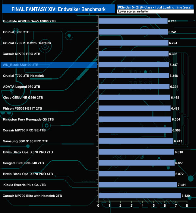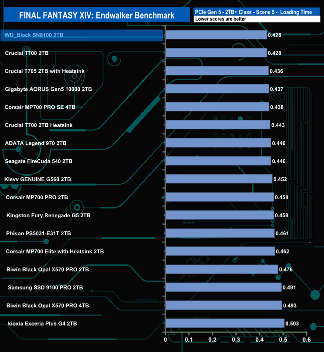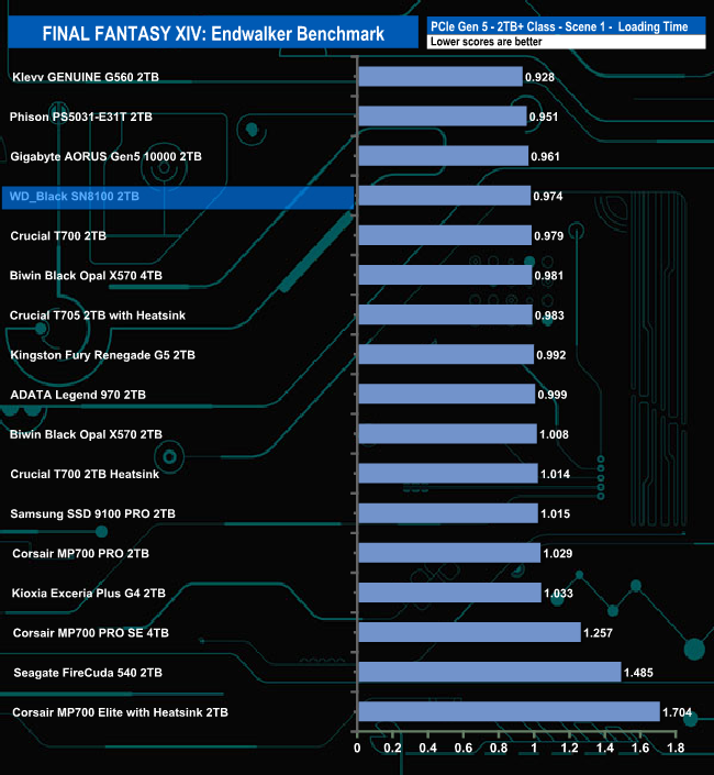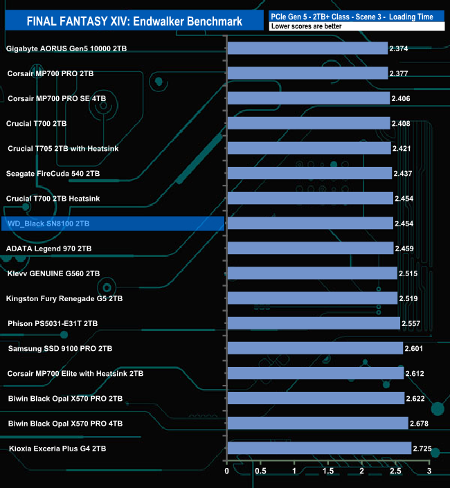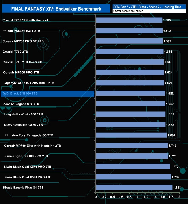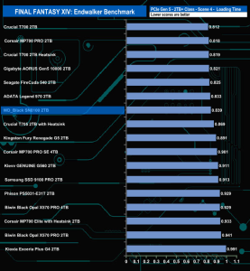 The drive handles the Final Fantasy XIV Endwalker Official Benchmark pretty well, ending up in fifth place. The drive tops the Scene 5 load test table.