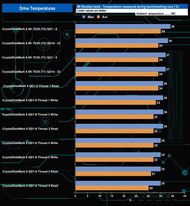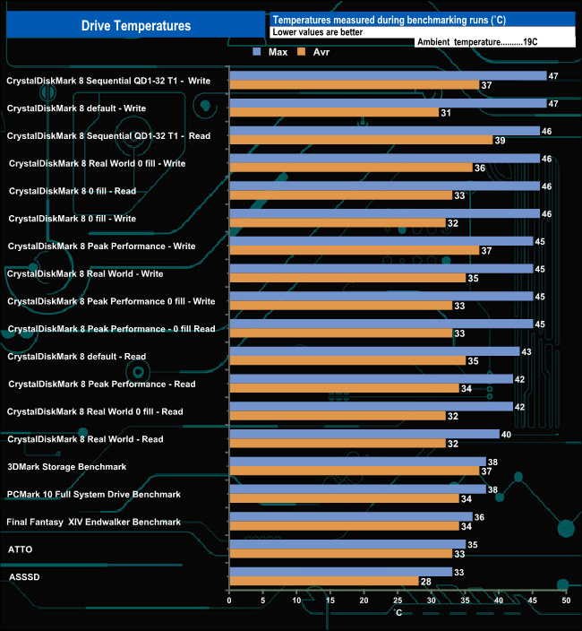 The drive only uses 7W of power when actively writing and 6.5W for reads, and thanks to the controller's 6nm process, it certainly didn't get that hot when being pushed by our benchmarks. The hottest it got was 47° C during a run of CrystalDiskMark 8 Sequential Write QD1-32 T1 test and the default Write test. For the bulk of our testing, the drive averaged 42° C, with the 4K focused tests averaging 36° C, both of these averages a long way from the 85° C maximum operating temperature of the drive.