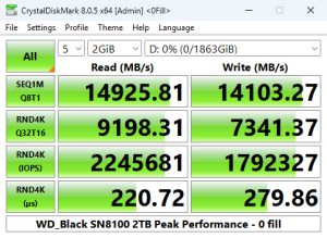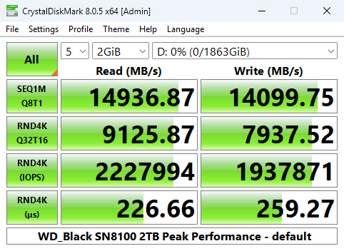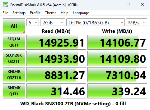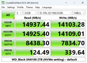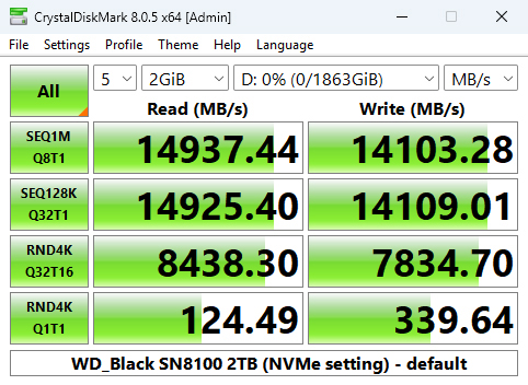 We can confirm the official maximum read/write speeds of the 2TB drive – up to 14,900MB/s and 14,000MB/s, respectively, with a default read test result of 14,937.44MB/s with a write result of 14,103.28MB/s.