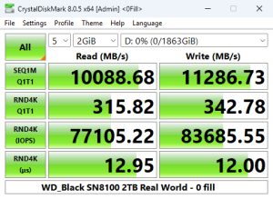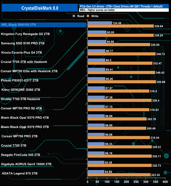 When tested with CrystalDiskMark 8's 4K QD1 1 Thread test, the 2TB WD_Black SN8100 produced a read score of 124.49MB/s, the fastest we've seen to date for a Gen 5 consumer drive. However, its write result of 339.64MB/s is only the fourth fastest.