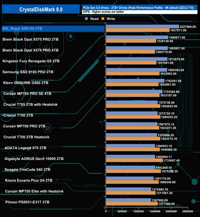 Switching over to the default Peak Performance profile, we saw a 4K random read best test result of 2,227,994 IOPS, a little shy of the official maximum of 2.3M IOPS. Even though it's shy of the official rating, it is the first drive we've seen that's cracked the 2M IOPS mark in this test. The best 4K random write score we saw was 1,937,871 IOPS, which is well short of the official maximum of 2.4M IOPS, but even so, it's still the fastest 4K write result we've seen so far in this test for a consumer Gen 5 drive.