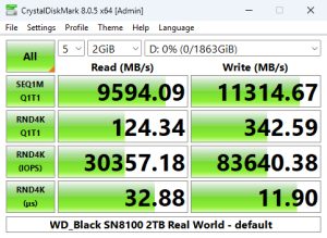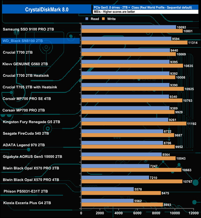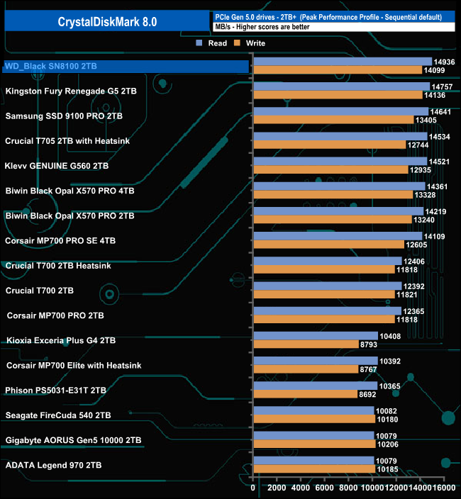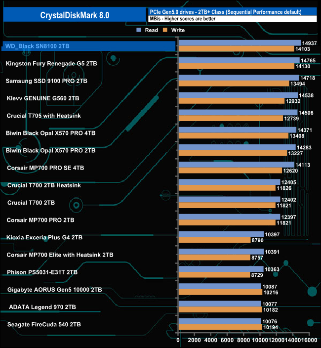 The WD_Black SN8100's Sequential read result of 14,937.44MB/s is the fastest we've seen for a Gen 5 consumer drive, but its write test result of 14,103.28MB/s is slightly slower than Kingston's Fury Renegade G5 drive.