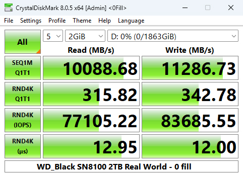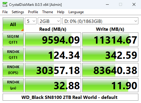 Using the Real World profile sees the drive sitting in second place behind the Samsung SSD 9100 PRO with a read result of 9,954.09MB/s. However, its write score of 11,314MB/s is a good deal faster than the Samsung drive.