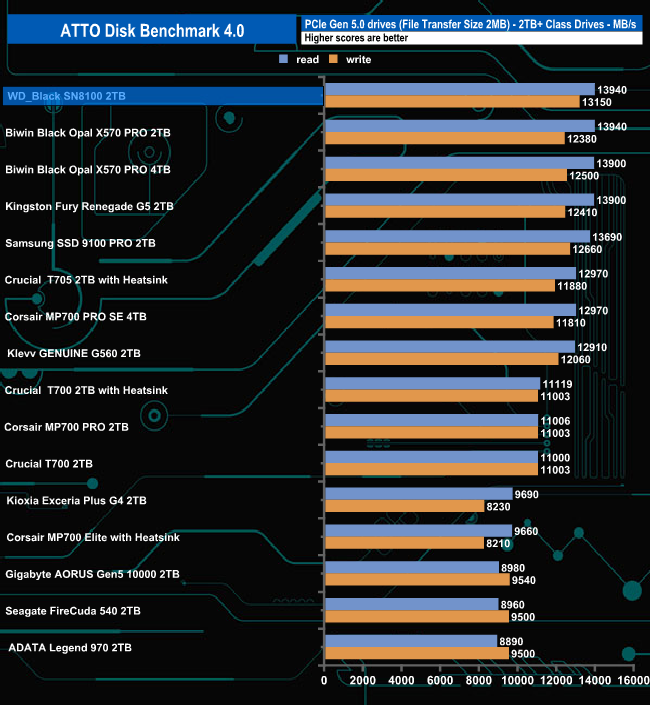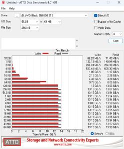 Using the ATTO benchmark, the best Sequential performance we saw from the drive was 13,940MB/s for reads and 13,150MB/s for writes, both well short of the official up to 14,900MB/s and 14,000MB/s for reads and writes, respectively. However, while short of the official ratings, the drive still sits in top spot on the results table, sharing the spotlight on read performance with Biwin's 2TB Black Opal X570 drive. The WD_Black drive, however, has much faster write performance.
