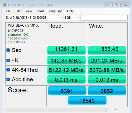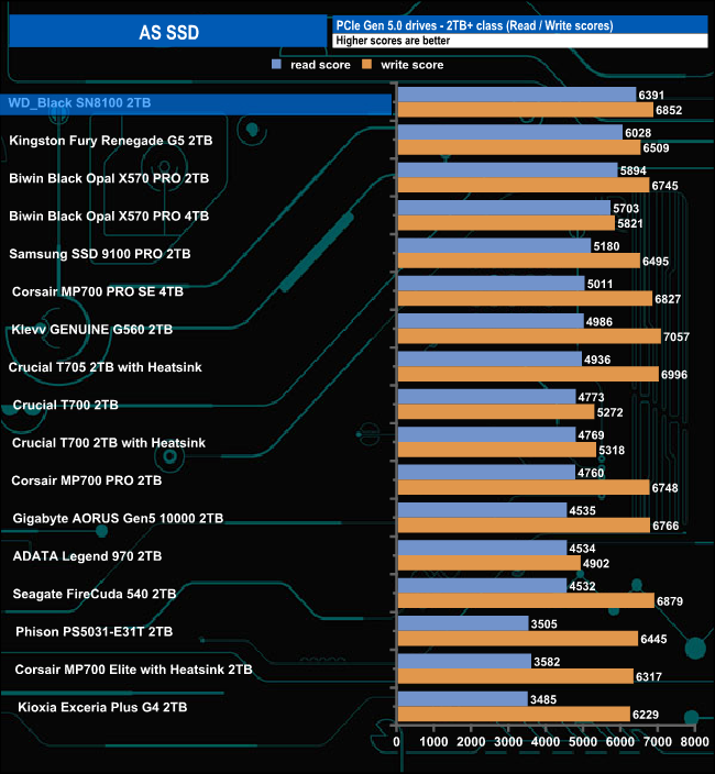 In the AS-SSD benchmark, the WD_Black SN8100 sits in the top spot on the results chart with a read score of 6391, but its write score of 6852 isn't quite as strong as its only the third fastest we've seen to date.