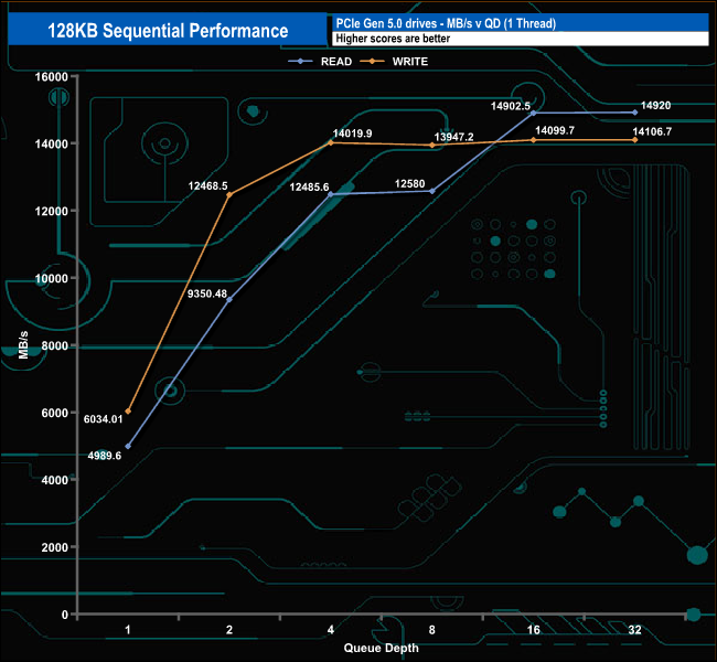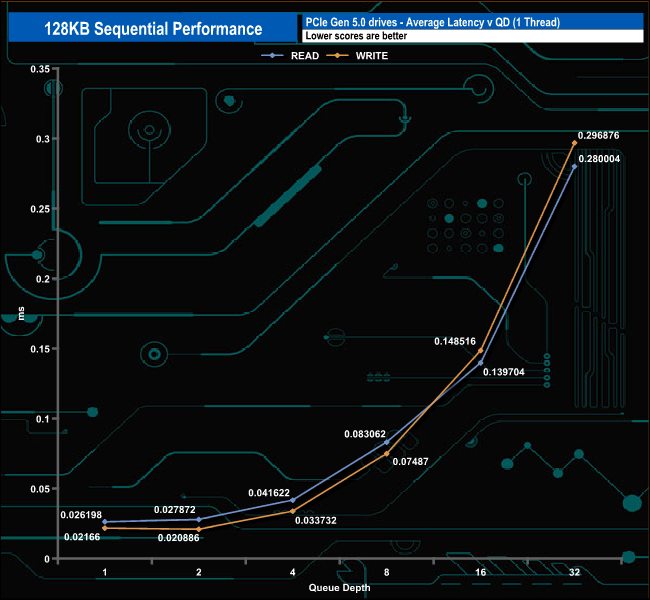 We used CrystalDiskMark 8‘s custom settings to test the Sequential read and write performance of the drive through a range of queue depths. The setup for the tests is listed below.