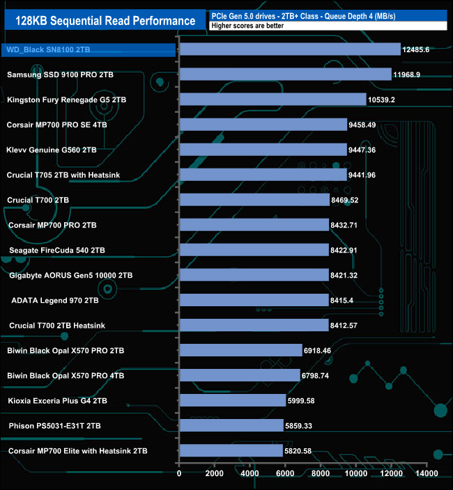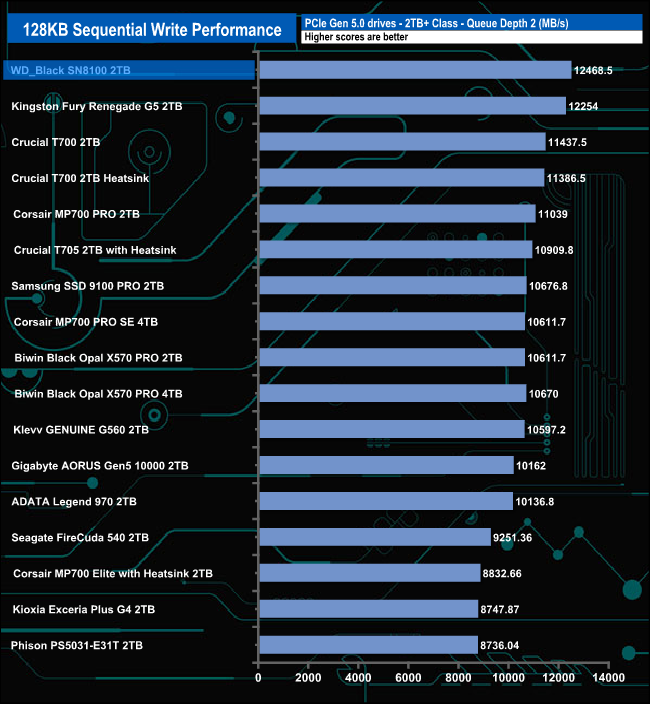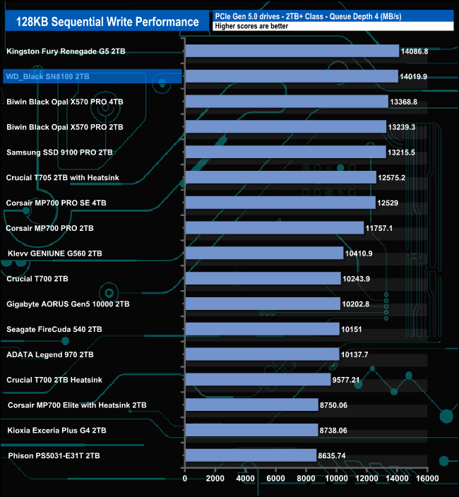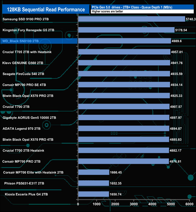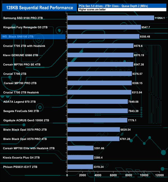 At QDs 1 and 2 the WD_Black SN8100 sits in third place behind the 2TB Samsung SSD 9100 PRO and Kingston Fury Renegade G5 drives, but at QD's 4 and 32, the SN8100 moves above both drives.