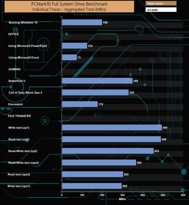 The PCMark 10 Full System Drive Benchmark uses a wide-ranging set of real-world traces from popular applications and common tasks to fully test the performance of the fastest modern drives. The benchmark is designed to measure the performance of fast system drives using the SATA bus at the low end and devices connected via PCI Express at the high end.