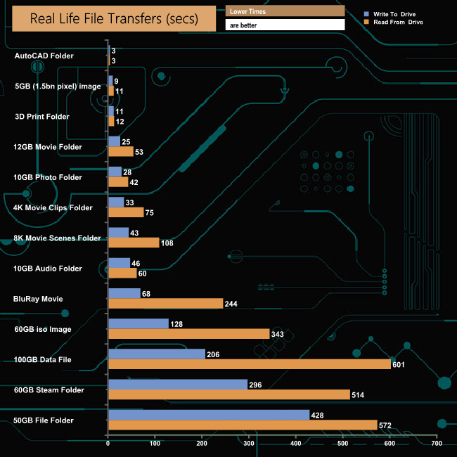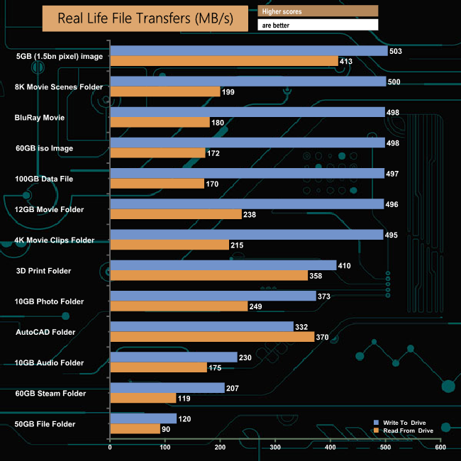 The Seagate FireCuda 120 handled our life file transfer tests without any real problems, with a couple of the transfers just creeping above the 500MB/s mark and with a few more just under. As is usually the case, the small files in the 60GB Steam, 50GB file and 10GB audio folders caused the performance to drop quite considerably.