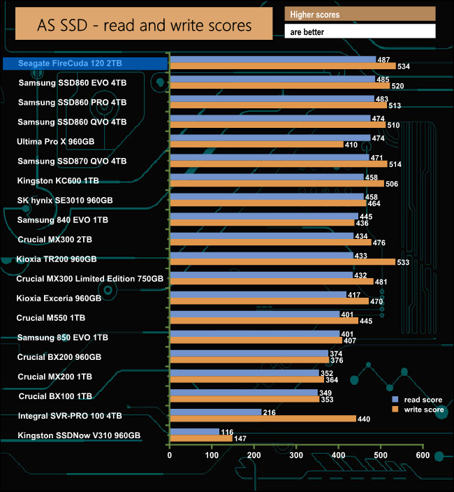The FireCuda 120's read score of 487 in AS-SSD is just enough to put the drive on the top of our results chart. Its write score of 534 is also the fastest SSD write score we have seen, but only just.